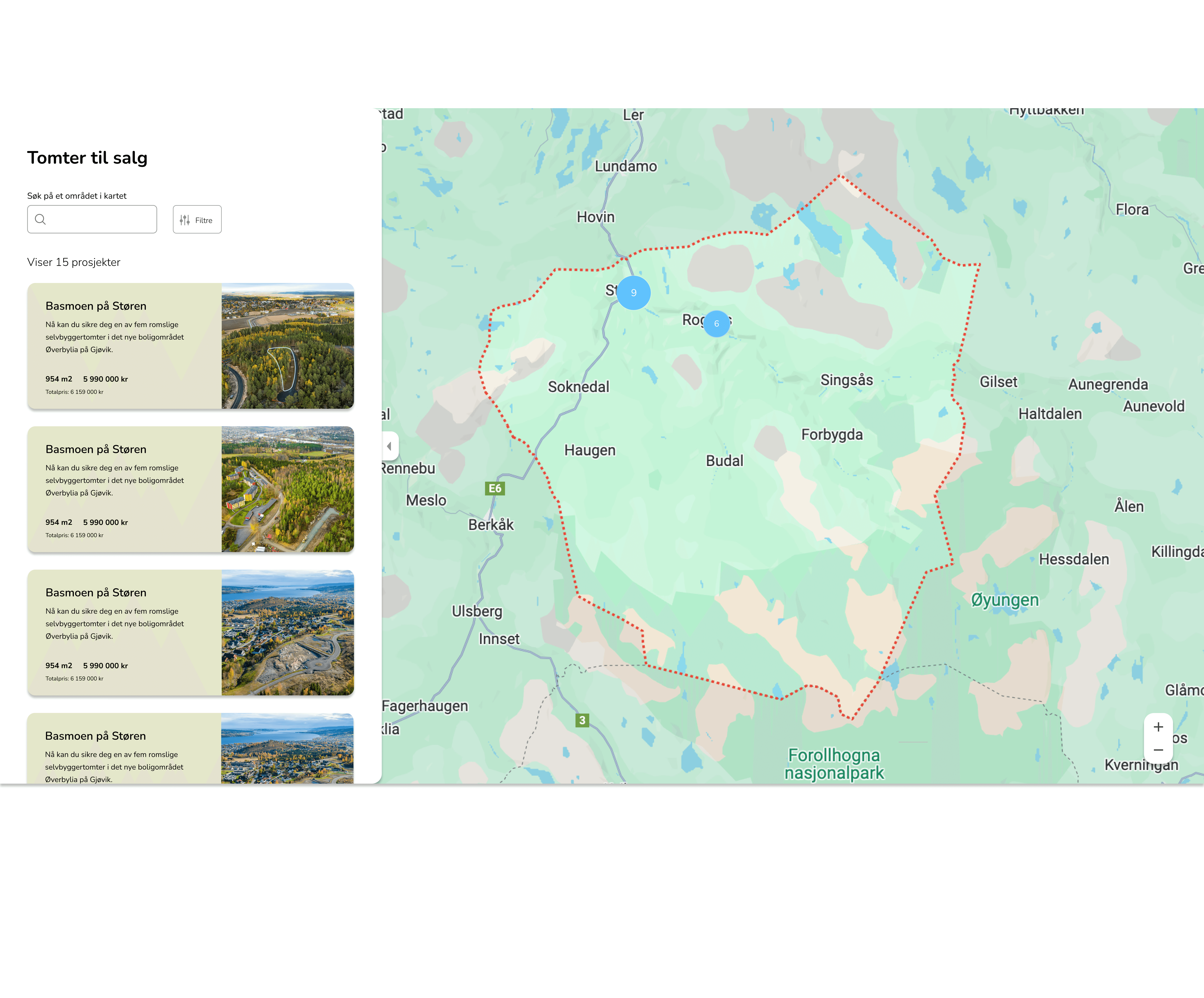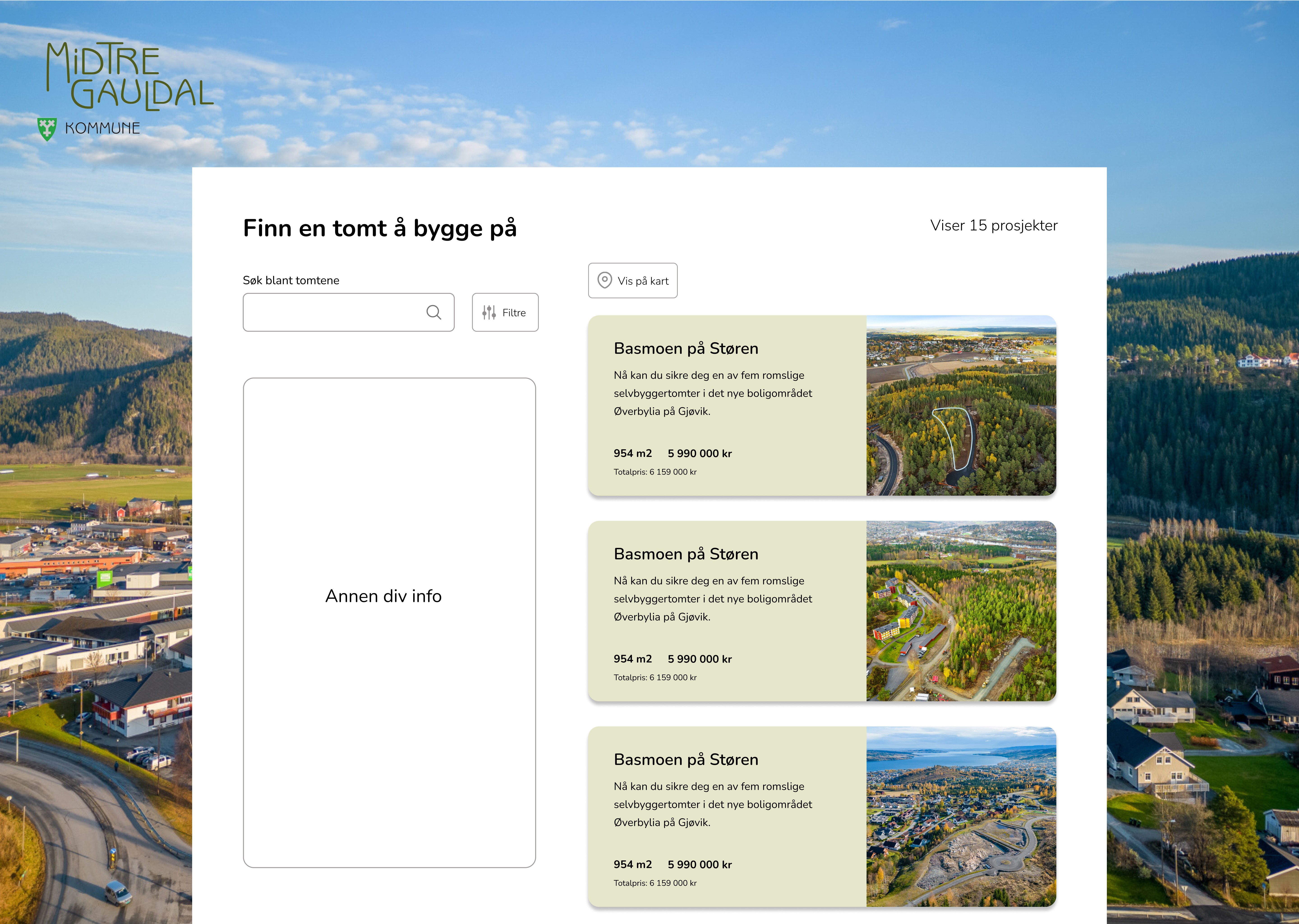 Kunden ønsket en kart-funksjon liknende den man finner på Finn.no, med muligheten til å finne tomter via selve kartet. Her jobbet jeg mye med side-menyen og hvilke filtre potensielle innbyggere i Midtre Gauldal kommune kunne trengt.